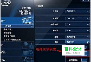 方法2: 另外还可以,通过桌面右键--“图形属性”--“一般设置”--“缩放”--缩放全屏来设置,如下图: