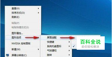 方法1: 如果你电脑使用的是NVIDIA显卡,那么首先不妨这样设置下显卡,在桌面空白处,右键——图形选项——屏面适配——缩放全屏。之后运行游戏能实现全屏显示,如下图:
