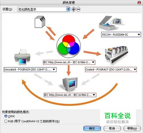二、CorelDraw的颜色设置 CorelDraw工具菜单下拉列表颜色管理如下图,在红框标记的地方按图设置,在蓝框标记的地方请选择与安装的扫描仪及打印机配套的预置文件,如果没装就按图设置,箭头按图点亮变红色