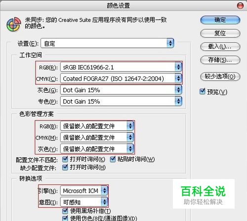 一、Photoshop的颜色设置: Photoshop编辑菜单下拉列表颜色设置如下图,在红框标记的地方按图设置并确定