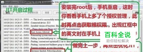 2、开启JIT 手机重启后,最好在手机的设置-声音与显示-屏幕待机为10分钟,当电脑上的FlashTool工具栏中的获得根权限亮起,请点击它,此时屏幕上会出现Root Access Allowed,这时请看手机上会弹出一个权限选项,请点击允许。FlashTool开始写入开启JIT的程序,安装过程结束手机自动重启,JIT开启完成,如需进一步开启xRecovery,请不要断开手机与电脑连接,继续下一步。