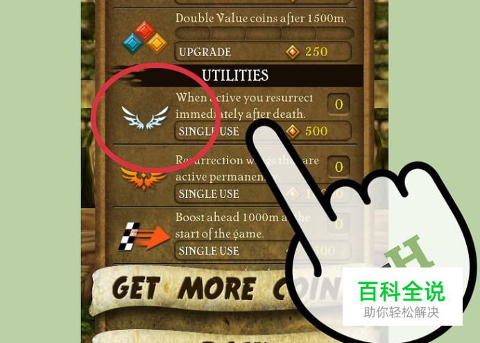 在商店中购买复活翅膀。你需要在逃跑过程中收集到 500 个金币才能够购买。