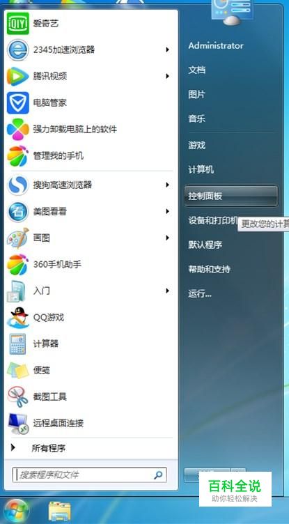 鼠标点击一下桌面左下角的“开始”,找到“控制面板”。