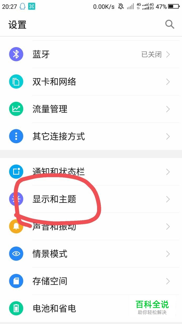 到“设置页面”之后,往下拉,找到“显示和主题”按钮,将其打开。