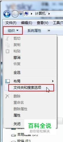 打开Win7系统“计算机”左上角的“组织”菜单,选择“文件夹和搜索选项”,勾选“导航窗格”下面“显示所有文件夹”和“自动扩展到当前文件夹”两个选项,最后按“确定”。