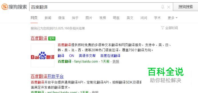 首先使用搜狗搜索“百度翻译”,然后找到官网进入。