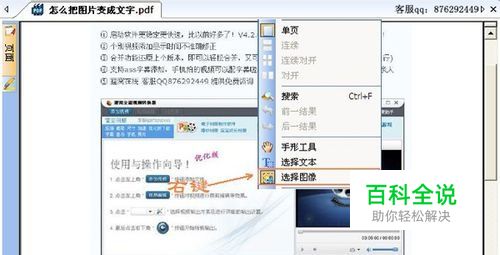 在开始之前要先得把图片转换成pdf文件,转换成pdf文件之后再打开软件, 选择文件 — 打开,或者按快捷键Ctrl + O打开刚才转换好的pdf文件。把鼠标移动到图片上面,右键选择 — 选择图像,这里的选择图像是选择图像上面的文字,选择了“选择图像”选项之后鼠标的形状就变了。