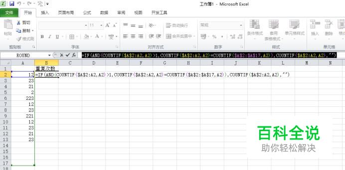 之后我们重复次数下方的单元格中输入公式=IF(AND(COUNTIF($A$2:A2,A2)>1,COUNTIF($A$2:A2,A2)=COUNTIF($A$2:$A$17,A2)),COUNTIF($A$2:A2,A2),""),然后我们按回车键;