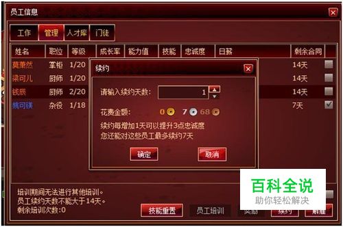 二、如何管理员工? 员工共分为:厨师、杂役、掌柜。等级以橙色为最佳白色为最次。游戏前期金钱紧缺,培养橙色员工成本较高,可以先使用绿色或蓝色品质的员工过度。培养、奖励、续约员工可以增加员工的忠诚度。