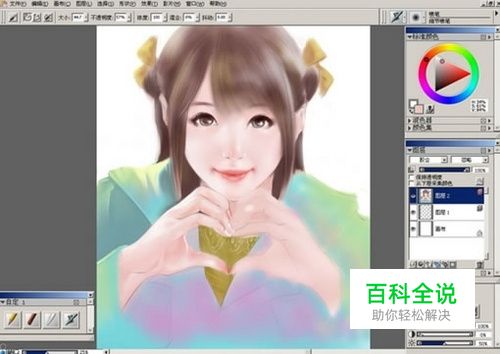 同层在衣服上添加一个可爱的蝴蝶结。新建一层,绘制衣服的花边,根据衣服的光影用橡皮工具结合数位笔的压感擦除花边的亮部。用喷枪工具简单的画出背景。这样绘制部分就全部结束了