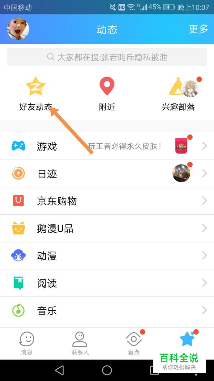 首先打开qq,点击最下边的动态,再点开好友动态如下图。