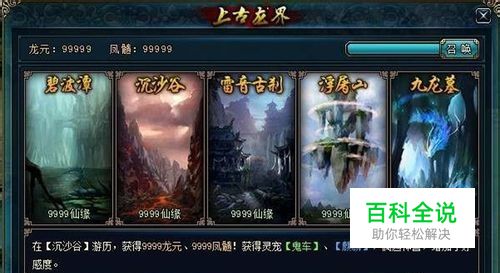一、灵宠的获取——上古龙界 (上古龙界UI设计图,具体以游戏更新为准) 1、点击【游历】,消耗[XiaoHao]仙缘,有几率向前/后移动。游历必定获得[HuoDe]【龙元】和【凤髓】,有几率获得[HuoDe]绿色和蓝色灵宠,有几率增加神兽好感度。 2、紫色灵宠只能通过累积好感度兑换,每遇到紫色灵宠增加一次好感度。顶部右边显示神兽好感进度条,当好感度达到满值时可点击按钮进行随机兑换。 3、获得[HuoDe]灵宠时,玩家可选择【收取】和【转化】;若玩家选择【收取】,则获得[HuoDe]灵宠;选择【转化】,可获得[HuoDe]一定【龙元】和【凤髓】。