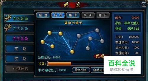 二、灵宠的等级——品阶 (品阶UI设计图,具体以游戏更新为准) 1)品阶概述 a) 品阶分为16个阶段:炼皮、锻骨、易筋……返虚、合道、鸿蒙,每一品阶又分为十重天。 b) 品阶每升一重天,右侧属性随之变化,战力相应变化。 c) 每次品阶达到第七重、第八重、第九重、第十重,都会相应的提升,主动技能、无双技能、被动技能、入场技能的等级。 2)灵宠进阶[JinJie] a) 进阶[JinJie]消耗[XiaoHao]【龙元】,有【修炼进阶[JinJie]】和【自动进阶[JinJie]】两种方式。点击【修炼进阶[JinJie]】,有概率升级到下一重天;点【自动进阶[JinJie]】,品阶升级成功[ChengGong]/龙元不足时,自动停止。 b) 玩家进阶[JinJie]失败时,会提高祝福值,即提高下次进阶[JinJie]时的成功[ChengGong]率。当进阶[JinJie]成功[ChengGong]时,祝福值清零。 c) 玩家在当前页面点亮所有星时,可进行【突破[TuPo]】。【突破[TuPo]】需要消耗[XiaoHao]一定【龙元】,且有概率成功[ChengGong],成功[ChengGong]则进入下一品阶。