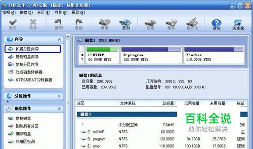 下载免费的分区助手,然后安装并运行它。您将看到下面的主界面,请点击蓝色圈住的选项“扩展分区向导”