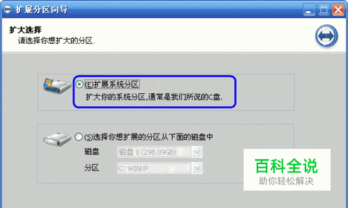 然后将启动扩展分区向导窗口,在这个窗口中选中“扩展系统分区”选项并点击“下一步”按钮