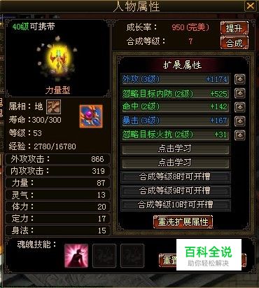 刚才也和大家说到了魂魄和宠物有一定的相似之处,魂魄在升级之后也有相应的成长率,也就是说升级之后所增加对应的属性点数,这里小便的RP还行不错,弄了一只完美的,如果想高攻高爆的话,魂魄提升至完美,这也是必须的,不然的话,属性的增加不会那么明显。再来是合成等级,这里要和大家说明的是,当合成等级达到5级时候,魂魄才会在游戏中显示出来,合成等级当然和是和扩展属性像对应的,当合成至5级之后,便可以在扩展属性中开出5个孔来,也就是说可以学习5个技能,在技能这方面,小编建议大家学习,内外功(根据职业决定),暴击,命中,属性攻击(根据门派而定),降低属性防御(这里根据学习的属性攻击决定),一般魂魄强化至5,再学习这5个技能,基本上,就没啥追求了,然后再升至10级,增加的数值,还是非常客观了,如果你喜欢追求极限,强化至10,那小编没话说,只求到时截张图来给小编抽出哦。