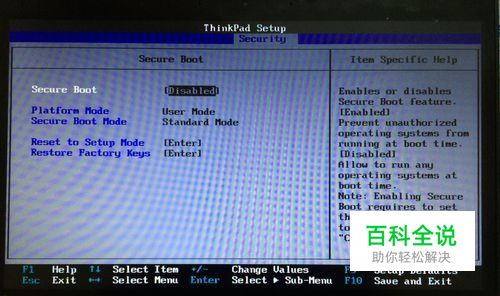 在“Secure Boot”中,将“Secure Boot”的状态“Disable”改为“Enabled”。之后后退选择“Startup”→“UEFI/Legacy Boot”→“Legacy Only”。(此步骤为打开限制,如果不进行1、2步骤,此选项为灰色,无法选中)如图