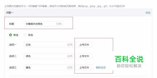 设置投票的问题名称,问题类型是单选还是多选,并设置投票选项;若是多个问题,在下面添加“添加问题”即可;也可上传选项图片,图片的尺寸是300像素*300像素,其他尺寸会影响页面效果,格式png,jpeg,jpg,gif。大小不超过1M;