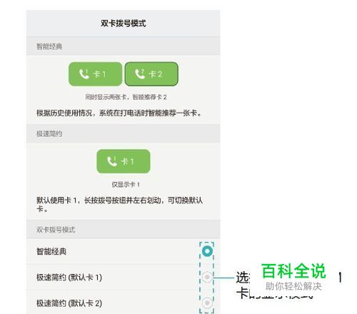 点击【双卡拨号模式】,可设置拨打电话时显示两张 SIM 卡或仅显示一张默认 SIM 卡。如果设定了默认卡,手机将优先使用默认卡拨打电话。