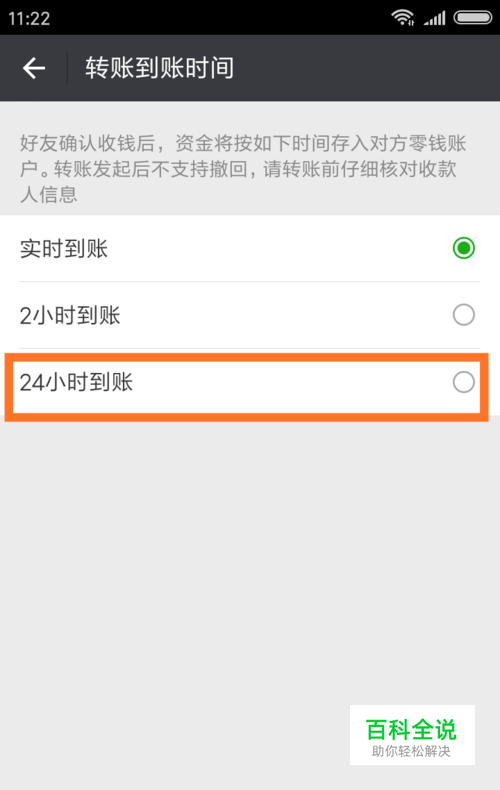 这时你会发现,有三个选项,“即时到帐”,“2小时到帐”,“24小时到帐”,这时我们立即选择24小时到帐,这样可以为我们赢得更多的处理时间。