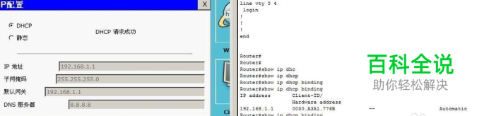在路由器通过命令:show ip DHcp binding可以查到一个客户端已经获取了IP地址:192.168.1.1 255.255.255.0 网关192.168.1.1;DNS:8.8.8.8;