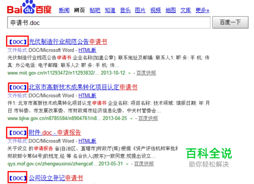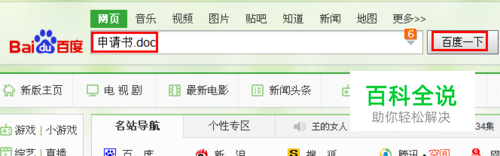 打开浏览器,在搜索栏输入想要搜索的内容的关键词比如“申请书”然后在后面添加后缀“.doc”,然后点击“百度一下”按钮。