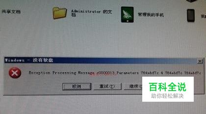 Windows-没有软盘,内容是Exception Processing Message c0000013 Parameters 764ebf9c 4 764ebf9c 764ebf9 提示下面有三项选择:取消 重试 继续 无论选哪个次对话框还是重复出现。。。。图文如下: