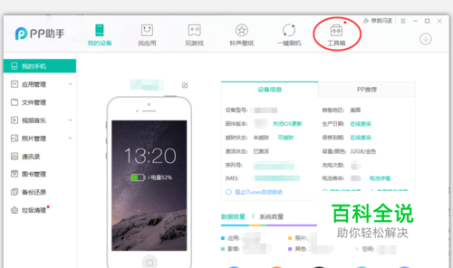 首先,手机与电脑需均安装有pp助手。将手机与电脑连接。打开pp助手可看到手机连接信息。点击“工具箱”。