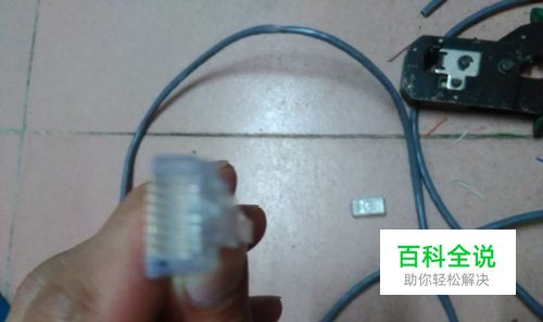 左手捏住8根网线不松手,右手套上RJ45水晶头。水晶头有金属触点的面向上,内有8根线槽,用于理顺网线用的。 从上方可以看到整齐的网线通过了内置的线槽中,左手用力的将网线推到里面,直到可以从正面看到网线切口的切口平面为宜。