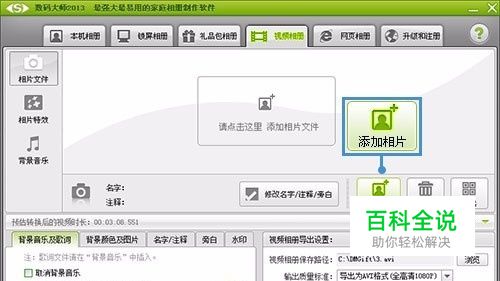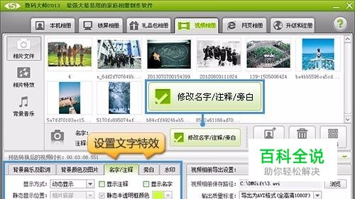 快速添加照片素材、文字说明 切换到“视频相册”面板,点击“添加相片”按钮,导入照片素材,当照片很多的时候,按住键盘上的“Shift”或是“Ctrl”键,就能一次性多选照片,进行导入! 点击“修改名字/注释/旁白”按钮,可为拍到的风景照、毕业照、家族照……配上到位的注释文字!如下图所示,在左下角参数设置选项卡上,可对文字样式、显示方式(动态显示、静态显示、不显示)等等进行个性化的参数设置!