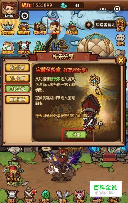 获取宝藏的钥匙的方法很简单,点击分享,点击“共获宝藏”,再点击分享,选择好友分享即可