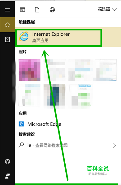 在打开的搜索框中输入“ie”,系统自动搜索出匹配的选项,我们点击【internet explorer】应用