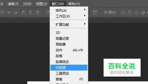 打开仿制源工具,点击“窗口”菜单下面的“仿制源”选项,就可以打开仿制源选项面板。