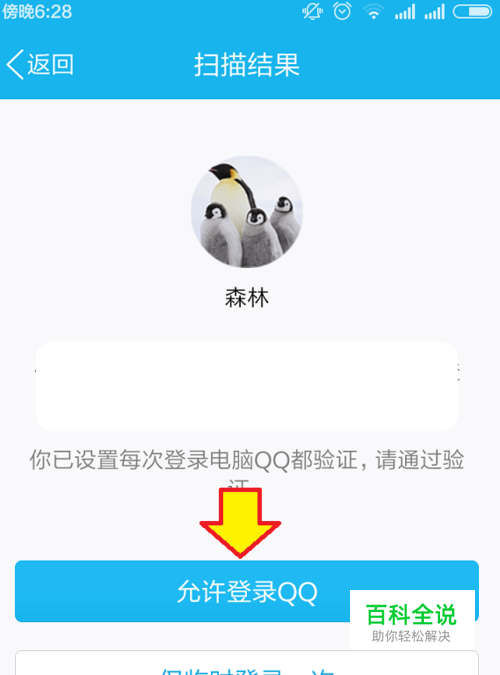 【电脑qq登录】 用手机qq“扫一扫”扫描第8步出现的电脑qq二维码,扫描成功后,手机出现如下图界面,其中,点击中间“允许登录”,电脑qq就立马登录了。完成。