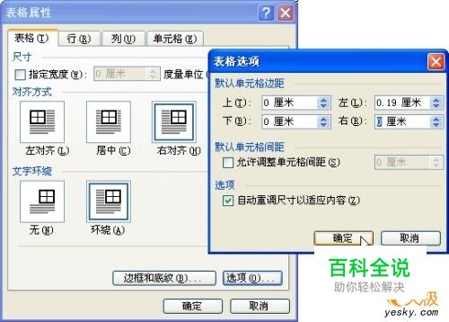 同理,如将表设置为“左对齐”,文字“环绕”方式,只要将在“默认单元格边距”下方的“左”选项框中的数字(0.19厘米)改为“0”即可。