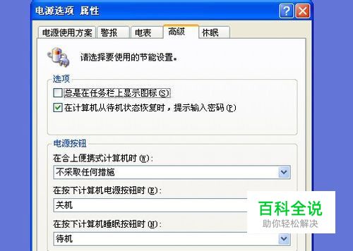 在弹出电源选项属性窗口,点击主菜单中的“高级”选项。(如下图)