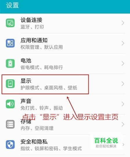 在设置主页,选择“显示”,进入新页面,即显示设置主页。