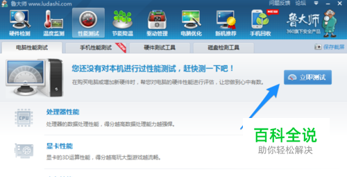 随后会对电脑的处理器、显卡、内存和硬盘性能进行测试,点击 “立即测试”按钮,如图所示
