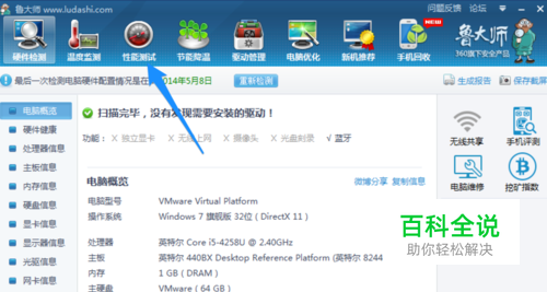 这里以鲁大师为例,打开软件以后点击上方的 “性能测试”图标,如图所示