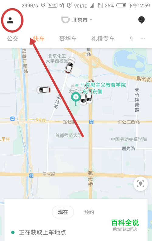 打开滴滴软件后,在界面左上角找到一个小人的标识,点击进入。