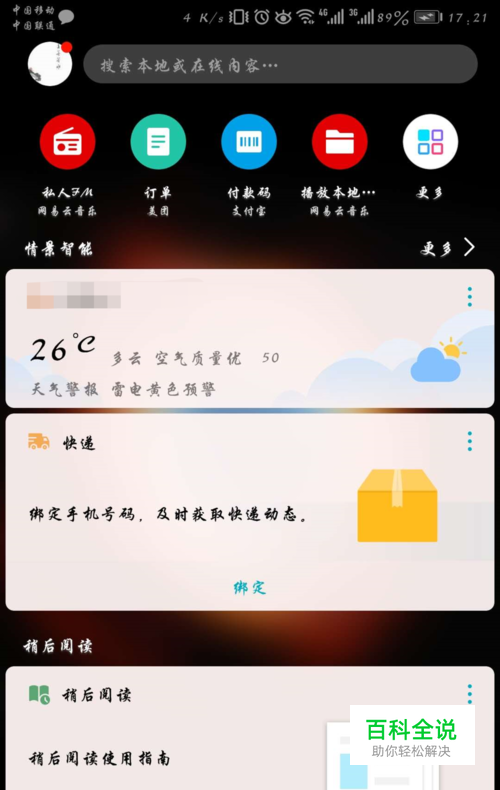 在手机主界面(按home键自动跳转到的界面)向右划,进入负界面
