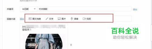 在设置关键词回复的消息内容,消息内容可以是:图文消息,图片,文字,语音,视频;添加需要推送的消息;