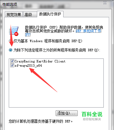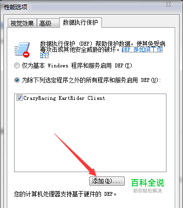 在弹出的 “性能选项” 窗口中,切换到【数据执行保护】 选项卡,并且选择 【为除下列选定程序之外的所有程序和服务启用】,点击【添加】
