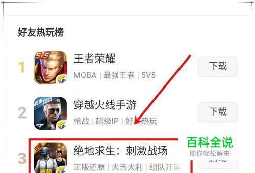 然后在游戏页面,向下滑动,在好友热玩榜中,就可以找到吃鸡游戏了,如“绝地求生:刺激战场”,或者直接在搜索栏中输入游戏名进行搜索。