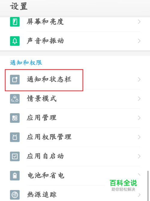 将设置界面下拉,找到“通知和权限”下的“通知和状态栏”选项,点击打开