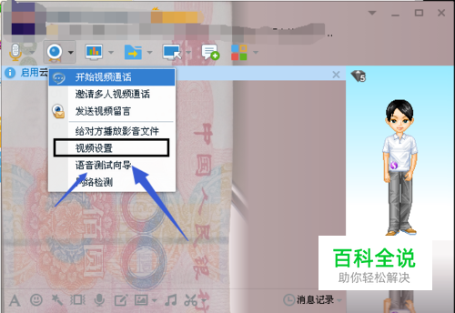 打开QQ随便点开一个好友,在对话框里面点开摄像头图标旁边的箭头---之后点击视频设置 如图