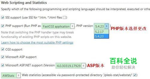 2.接下来进入之后会在页面底部看到Godaddy美国主机当前的PHP版本和ASP的版本信息。如下图所示,点击“PHP version”可看到PHP有5.2.17和5.4.23两个版本进行选择,这里我们选择5.2.17,点击OK按钮进行确认更改即可。然后就是等待过程了,大概20秒左右的时间,Godaddy美国主机的PHP版本就会更改好,并跳转到Plesk面板默认页面。