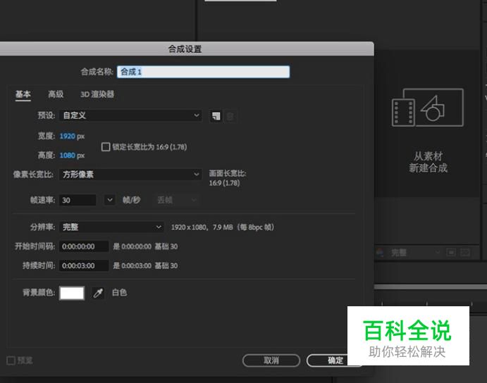 在纯色设置界面,高宽都要和合成的尺寸一样,颜色随意选择,点击“确定”即可。