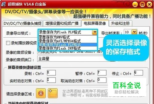灵活选择录像的保存格式。 这款软件支持将录像保存为AVI,WMV,FLV,SWF等诸多流行格式。其中WMV,FLV都是目前流行的网络流行格式,体积小而清晰,我们可以根据自身需要灵活进行选择!