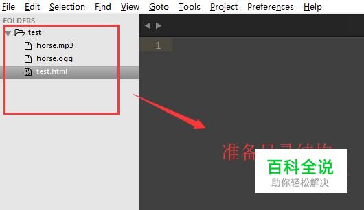打开Sublime Text工具,准备好如下图所示的目录结构,目录里面包括要插入的音频文件和一个html文件。